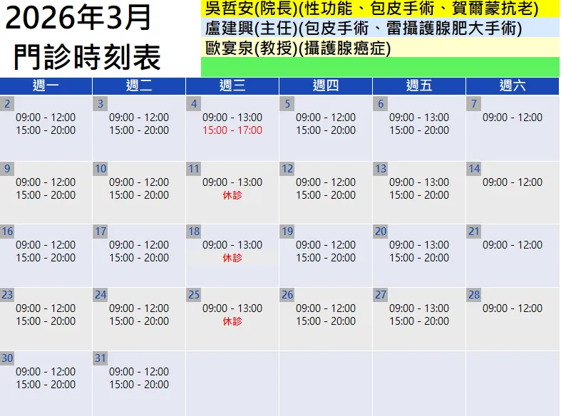 2026年3月看診時間表| 泌尿科推薦| 台中泌尿科推薦| 台中泌尿科